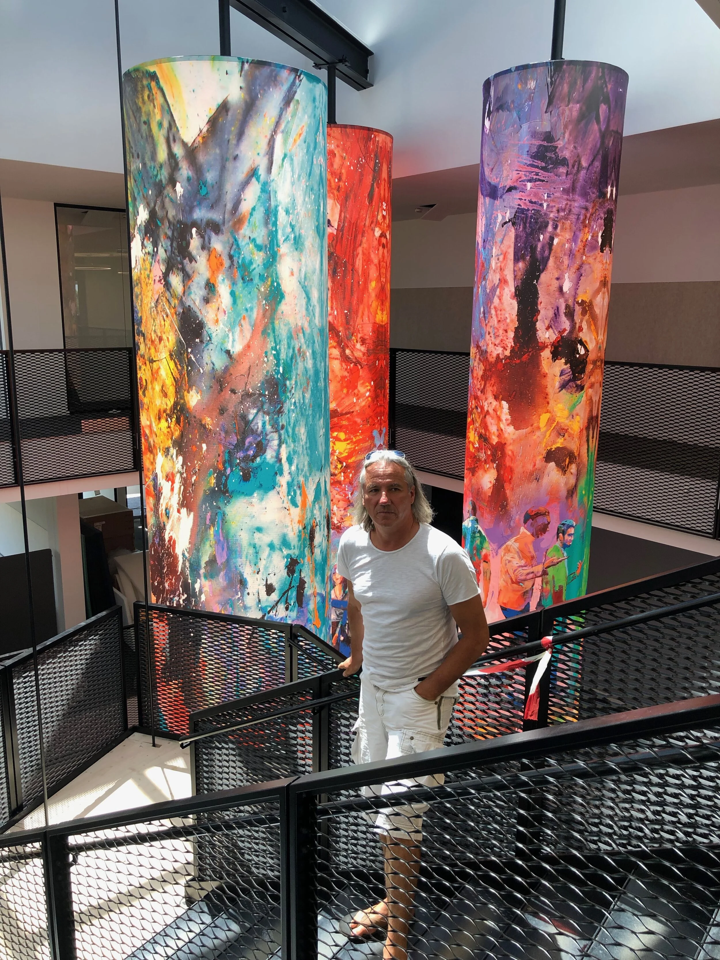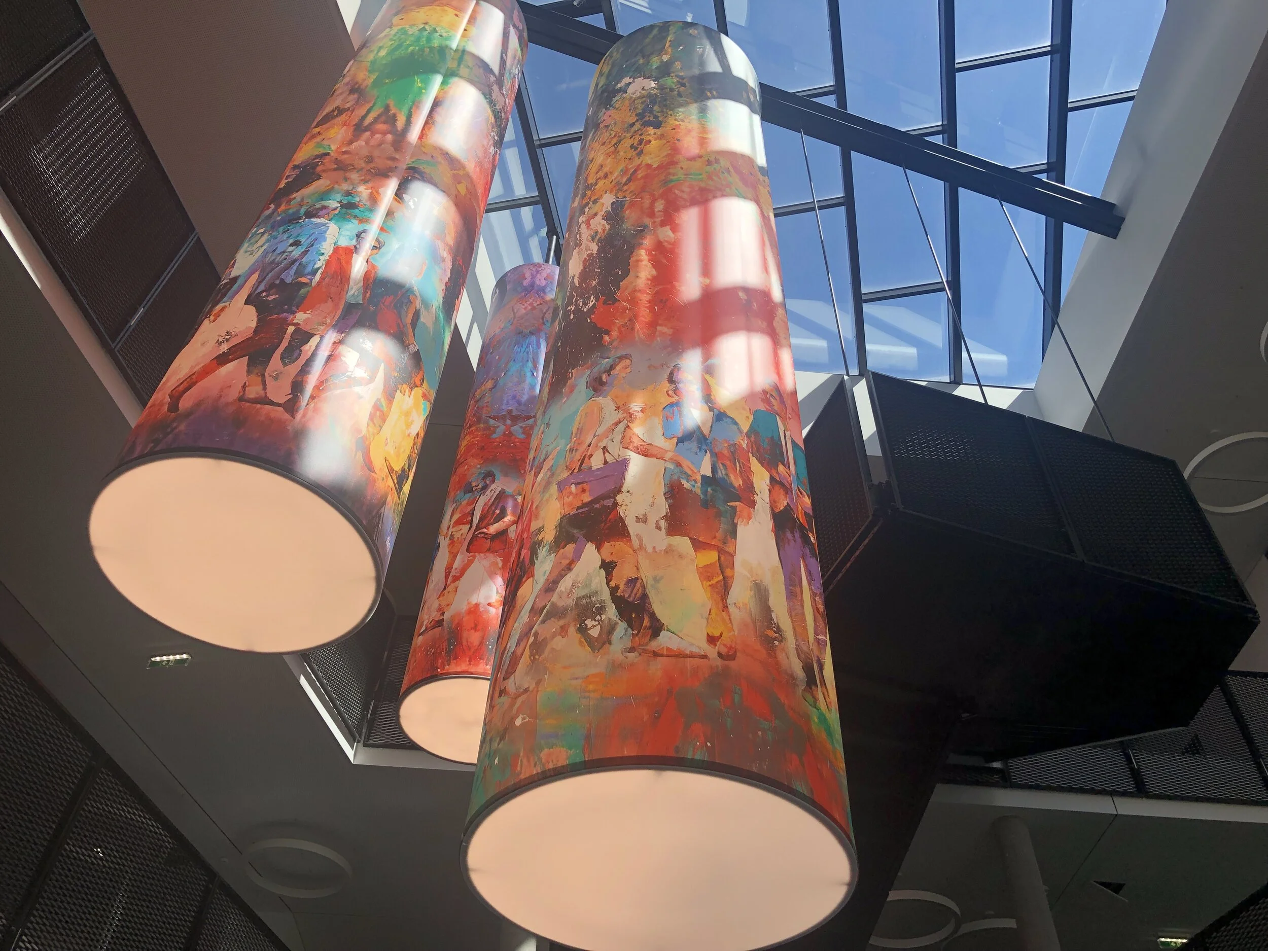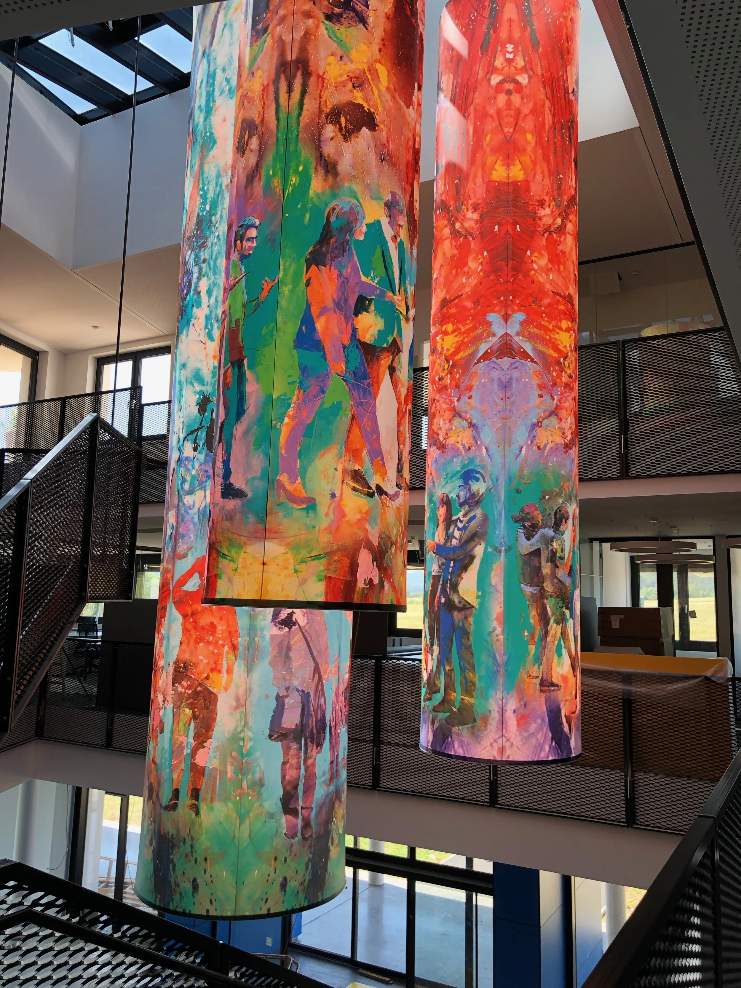 The new Mediashop building in Neunkirchen / Austria shines with VOKA Art columns. Thank you for your trust to the entire Mediashop team. The idea was to make the interior of the building artistic and to fulfill it with movement and life. The design in the entrance area consists of 3 columns of light, which are up to 7 m high and have a diameter of 1.5 m. There were 3 large-format acrylic paintings on the subject of "people in motion" made and then printed on textile canvas. The entire interior of the columns is equipped with LED lights and can be controlled differently. Thanks to Kathi Schneider, Dieter Schneider and the whole team.