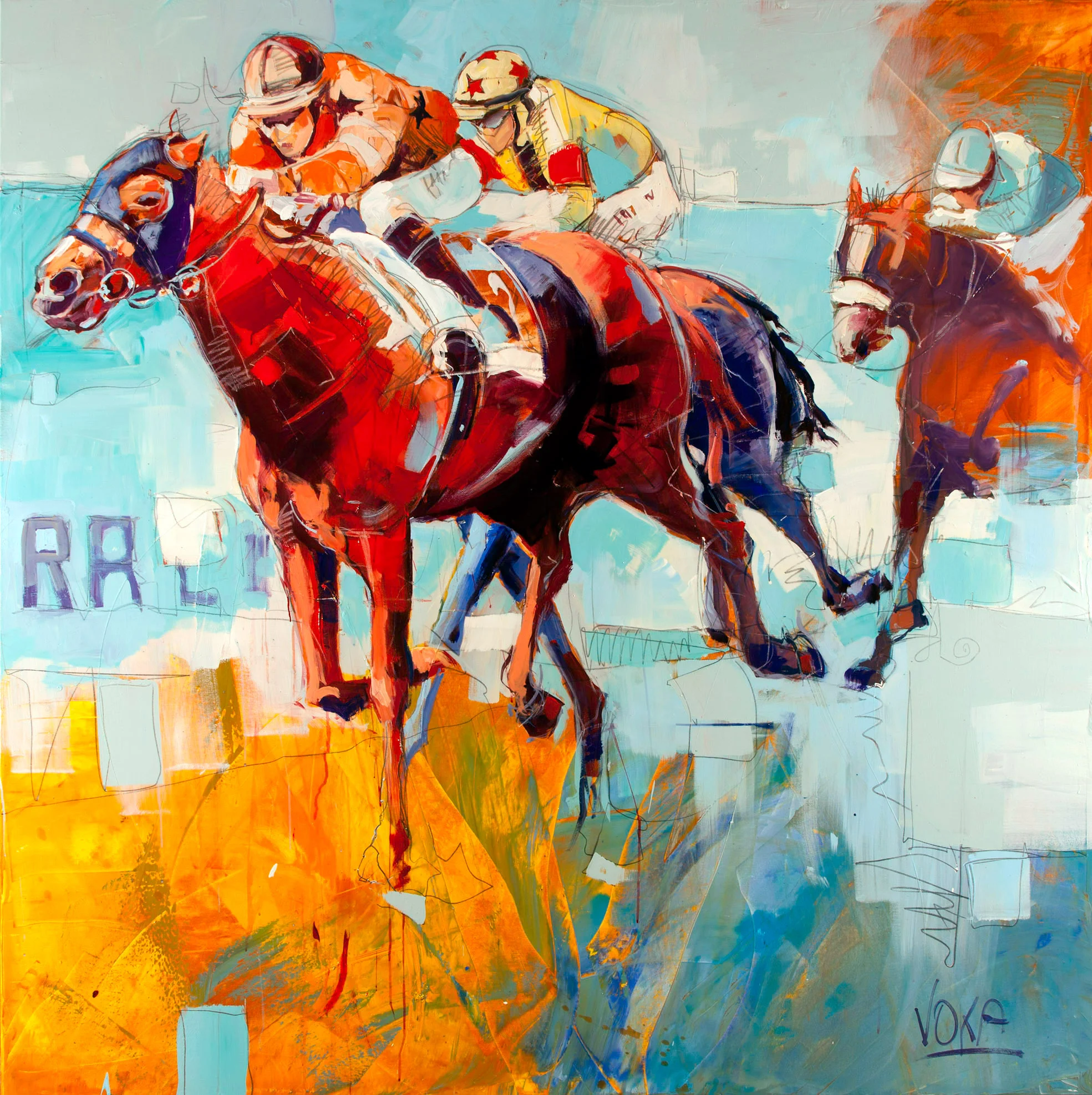 With his distinctiv style of painting, which envolves from the dynamics of the momentum, VOKA captures impressively consolidate the recognizable reality and the constant. His actions to exciting scenes with other mobile movements and emotions, which also represent him for viewing, of motifs from the world of sports. His respective works have already been improved on many international sporting events, including the British Golf Open in Sandwich, the Tennis Mercedes Cup in Stuttgart, the PGA Tour in Florida and the Beach Volleyball Grand Slam in Austria.